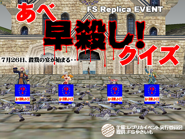 ニューヨークへ行きたいか!? 罰ゲームは怖くないか!? 阿部を殺したいか!! 阿部を殺して、クイズに答える。 クイズに答えて、阿部を殺す。 楽しさ2倍でお得さ満載♪ レプリカが送る新感覚クイズ番組! 「あべ早殺しクイズ」 7月26日午後10時より放送スタート!